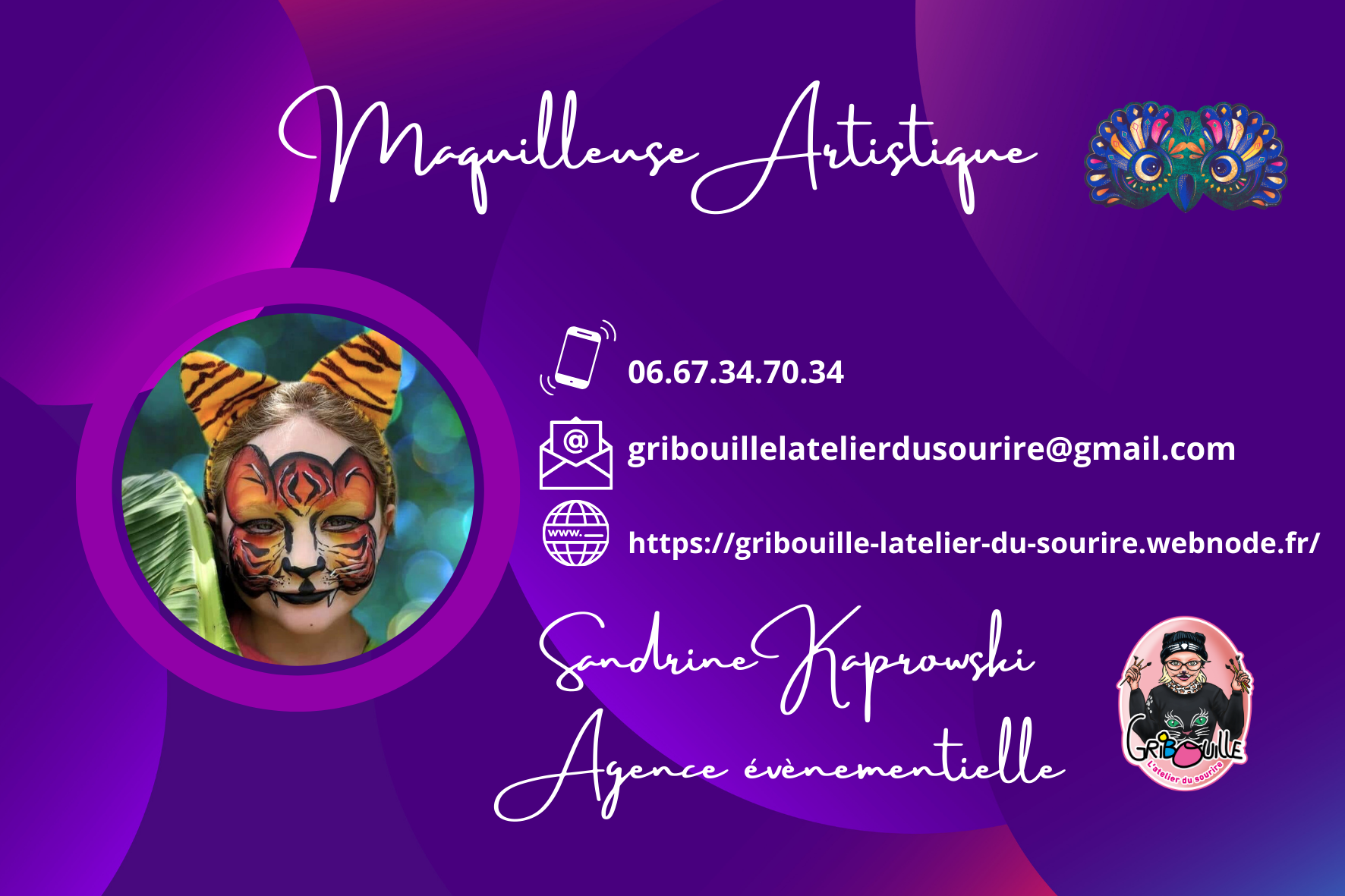 Spécialisée dans le Face Painting maquillage artistique, grimage , le tatouage paillette waterproof et au Jagua , le Belly Art prénatal, le Body Painting, de décoration à la peinture des vitrines, les ateliers créatifs et récréatifs (diorama Playmobil en collaboration avec l'association CrazyToys dont je suis membre), et interclasses, Gribouille l'Atelier Du Sourire offre un service professionnel, amusant et convivial.